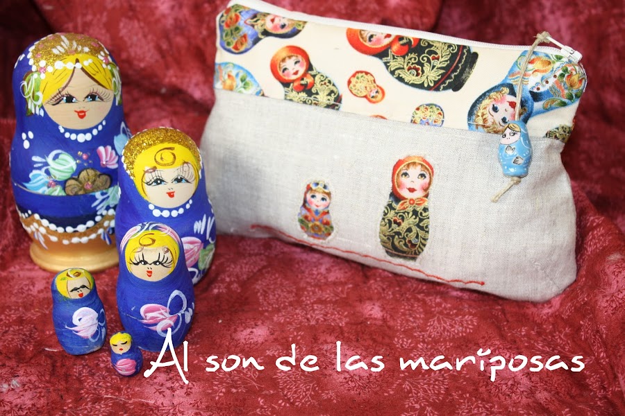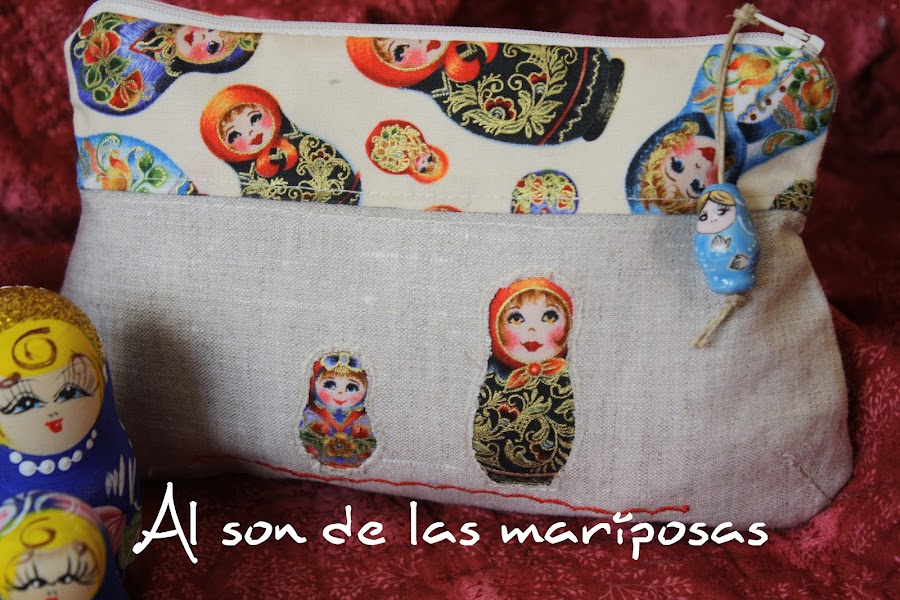 Combina tela de lino en color natural, con tela de algodón con simpáticas matrioskas.