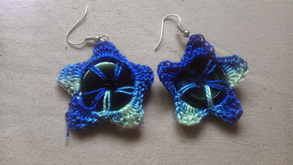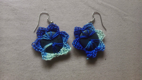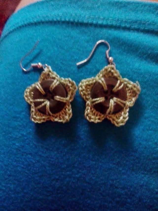 Por la red vi unos pendientes hechos con botones y a ganchillo que me encantaron. Una amiga hizo unos y ya me picó totalmente: Yo quiero los mios¡¡¡¡¡ Así que verde de envidia me puse a hacer unos para mi. Y como estaba verde de la envidia escogí unos botones verdes e hilo caqui. Un color un poco raro así que tuve que esperar un día para estrenarlos porque al día siguiente me vestí de azul (eso me pasa por vestirme casi dormida sin pensar)