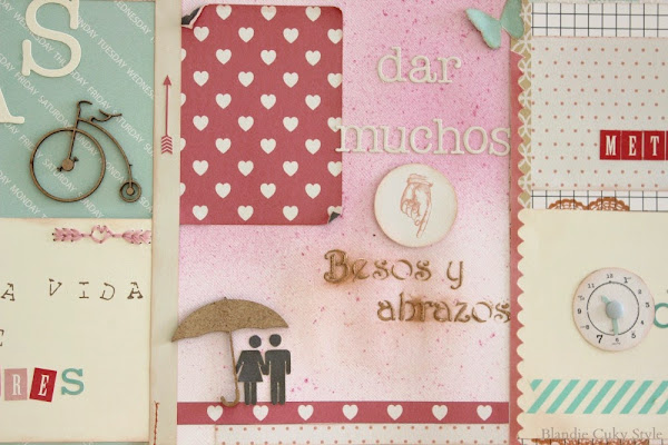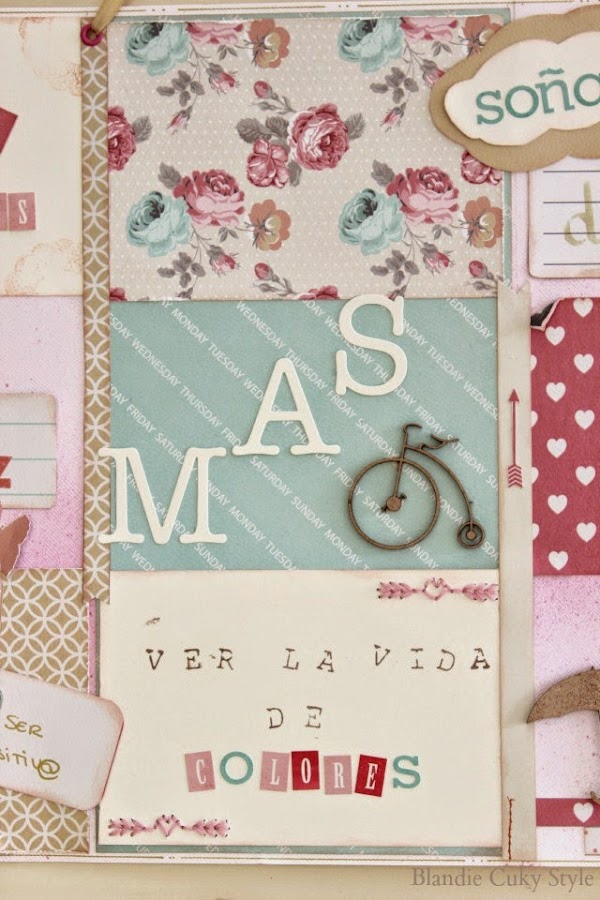 Quería que estuviera llena de colores, detallitos, frases chulas...y para eso, tenía que encontrar una colección de papeles de scrap que me gustara. Al final, después de cruzarme Valencia varias veces en busca de los papeles soñados, me decidí por una colección de Teresa Collins. A la vista está que es una pasada.