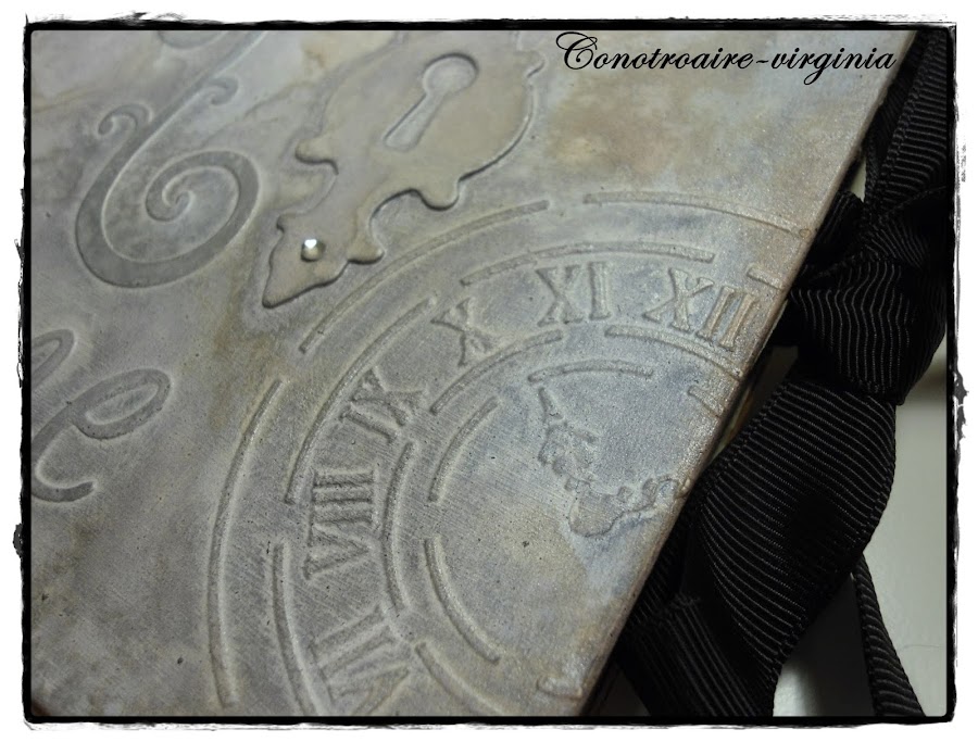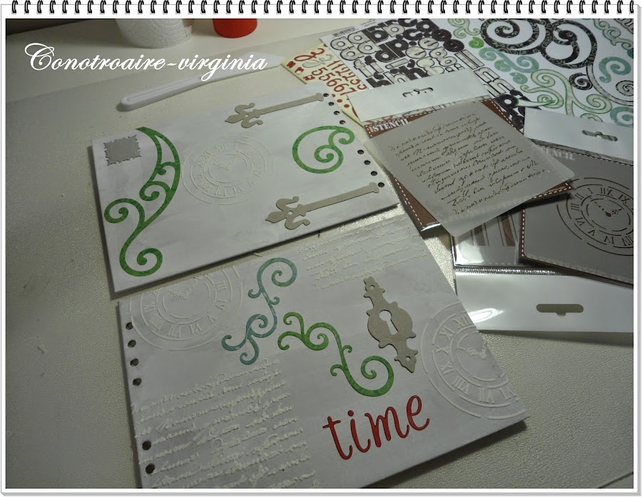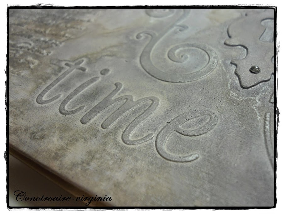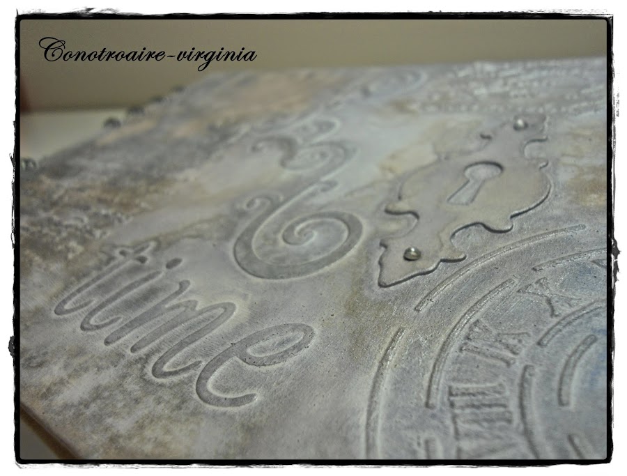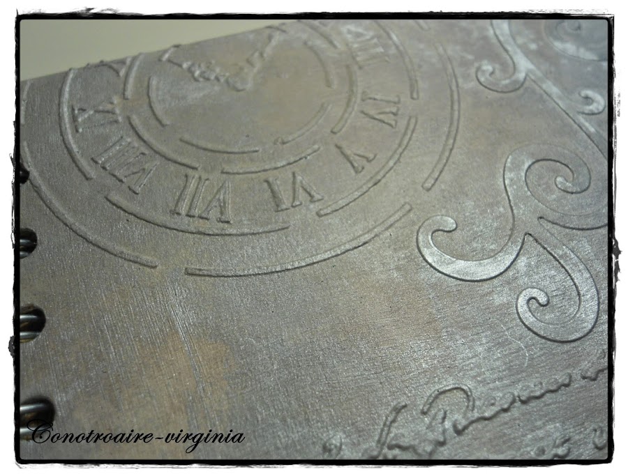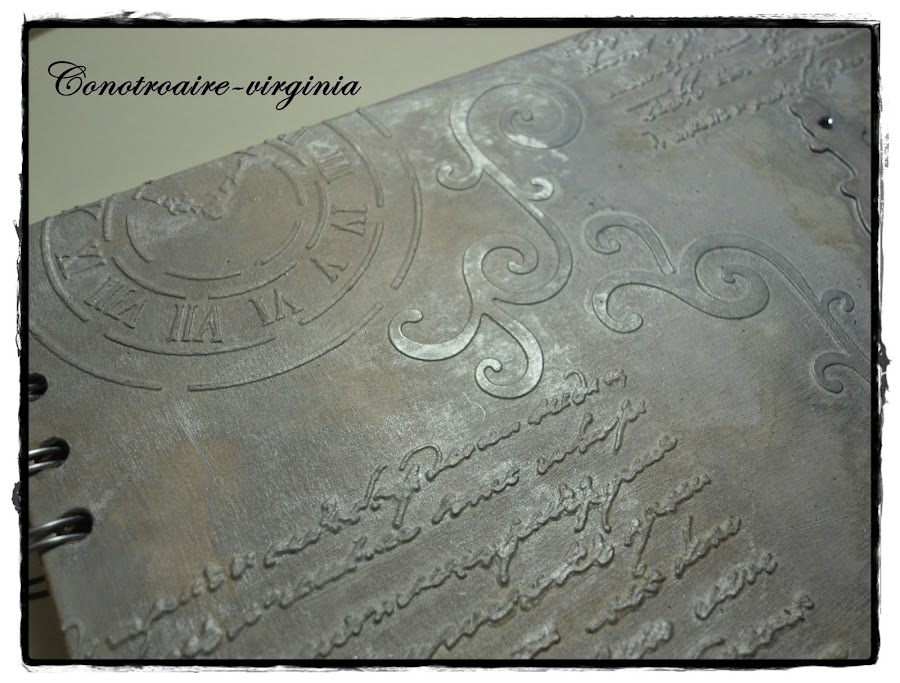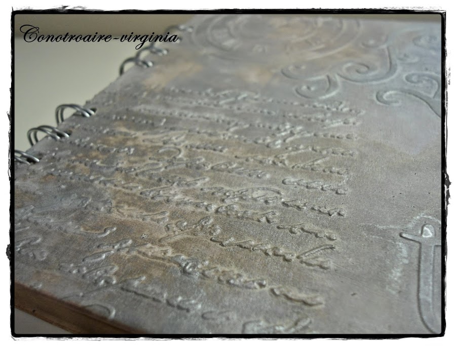 Las tapas son de cartón de color marrón, le di una capa de gesso blanco primero, luego puse las pegatinas, los troqueles, los stencils..........y lo unifique todo dando un par de manos más de gesso.
