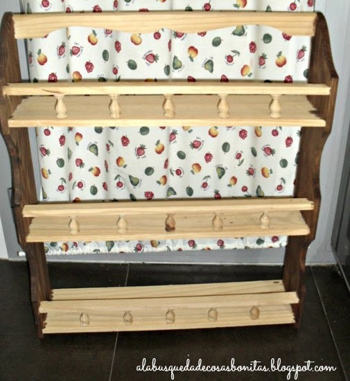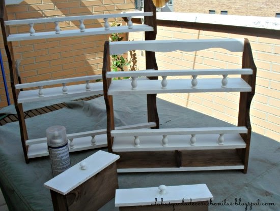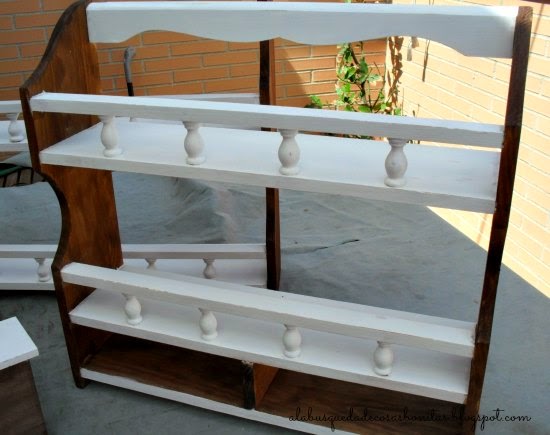 Como no era capaz de dar con nada que me gustara y que se adaptara a la idea que tenía (blanco y madera oscura) decidí hacerlo yo misma... Así que un viernes que salí pronto del trabajo, me encaminé al mercadillo del pueblo donde vivo y en un puesto de artículos de madera en crudo, me hice con estas dos estanterías: