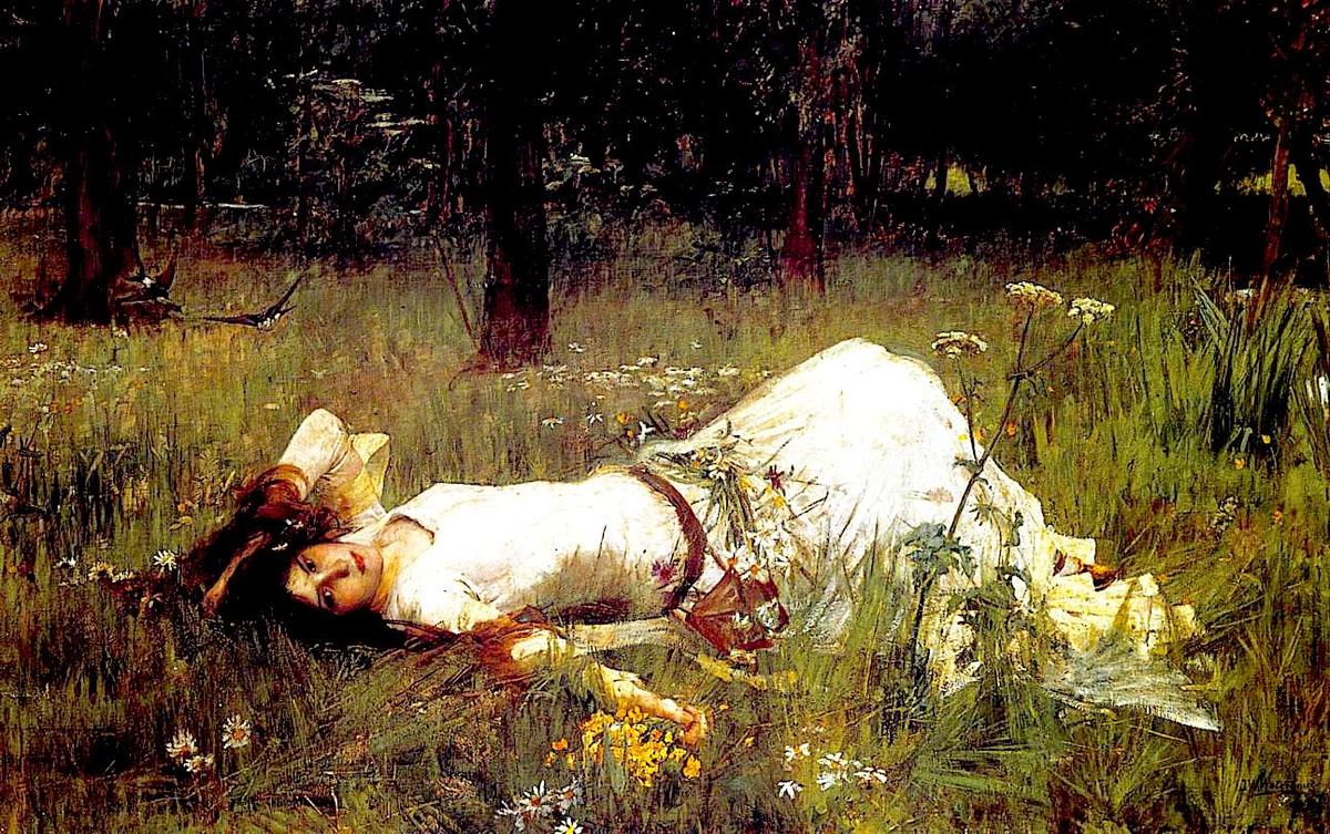 Ofelia es un personaje de Hamlet una famosa obra de Shakespeare. Una mujer joven, en la plenitud de la vida, se ve involucrada entre el supuesto amor de Hamlet, rey de Dinamarca, y la obediencia a su padre, que estaba convencido de que el jóven era un crápula. Al final la joven, medio loca, se sube a un sauce, la rama se rompe y cae al río ahogándose. Este espíritu vulnerable, de sufrimiento infinito, de belleza seccionada en la juventud impacta en los pintores del siglo XIX como una tormenta en el mar. Unos cuantos pintores, arrastrados por el movimiento pre-rafaelita, de tragedia y melancolía, y fuerte presencia de la naturaleza plasman sus obras sobre esta mujer inventada en una historia de triste final.
