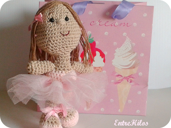 El cuerpo lo he tejido en rosa, simulando el maillot, hasta la zona del escote y cuello, y en los pies los primeros puntos hasta donde se empieza a menguar, también en color rosa, simulando las zapatillas.