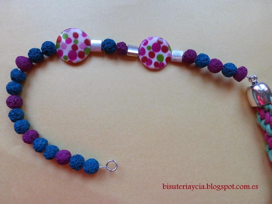 Ahora vamos a continuar el collar para ello , yo he utilizado: almabre metálico fino, unas bolitas de piedra de lava, unas piezas de nácar y abalorios metálicos.