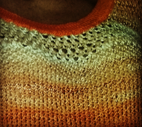 El cuello y las mangas se tejieron en algodón naranja, ya que una vez más calculé mal, esta vez el número de ovillos (usé 6) y me quedé corta.