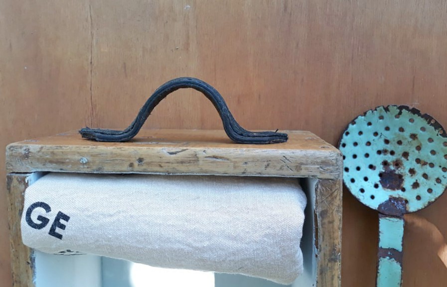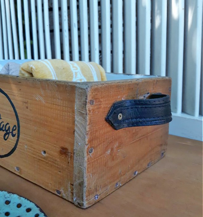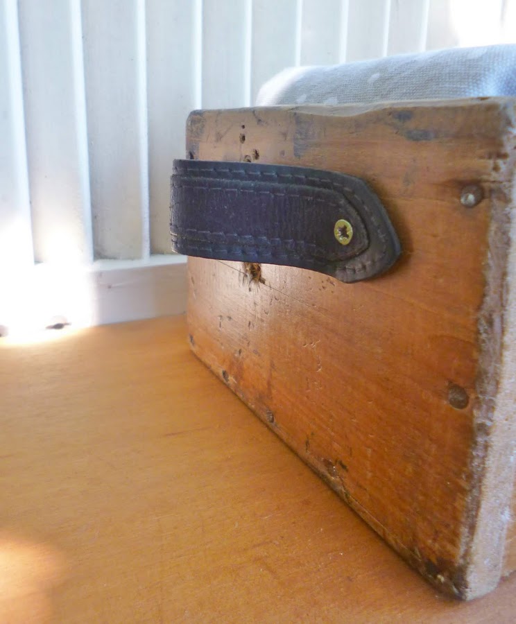 Usé un cinto viejo a modo de asas que atornillé al cajón.