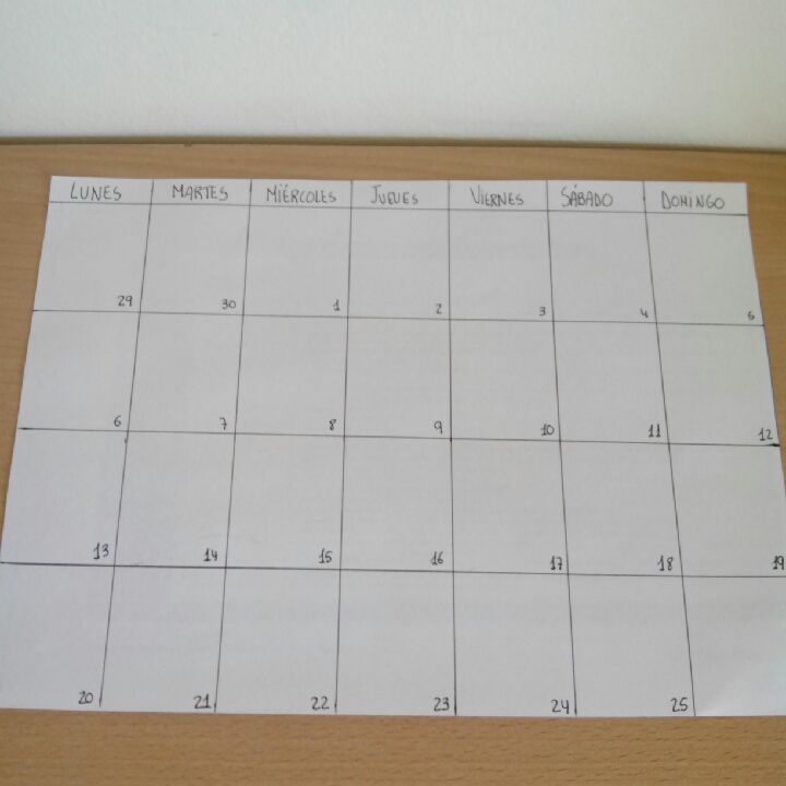 Empezamos midiendo el folio para calcular el tamaño de los cuadrados para que queden iguales (puedes hacerlo de 5 días o de 7 días).