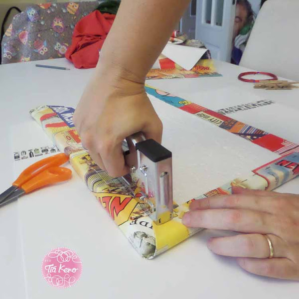 Lo primero que vamos a hacer es forrar la plancha de poliespan con la tela, para ello la grapamos a la plancha con una grapadora de tapizado.