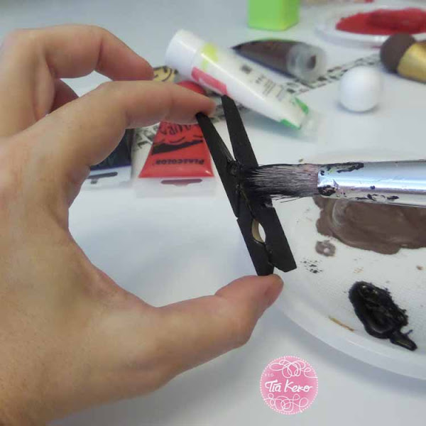 Una vez tenemos las pinzas pintadas y secas, las vamos a pegar al panel con cola blanca y lo dejamos secar unas 24h.