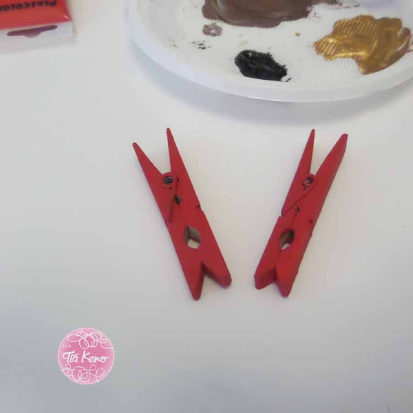 Una vez tenemos la plancha forrada, nos ponemos con las pinzas de la ropa. Las pintamos de los colores que más nos gusten. Yo elegí: negro, rojo y plata para combinar con los colores del estampado de la tela.