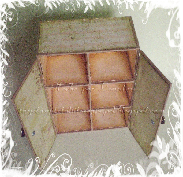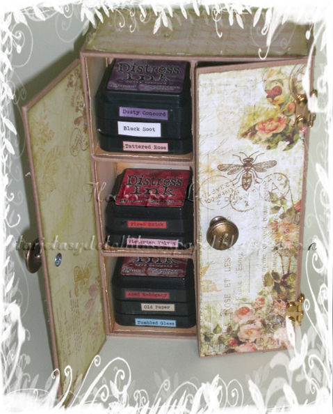Está hecha para contener unas 24 tintas y consta de una puerta con pomos como antiguos y unas pequeñas bisagras.
