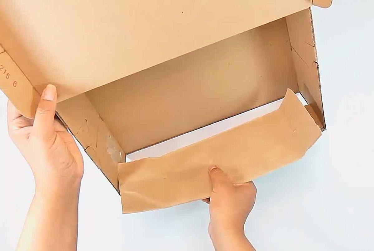Refuerza la parte superior del corte con un trozo de cartón y pega papel kraft para cubrir el canto y reforzar aún más.