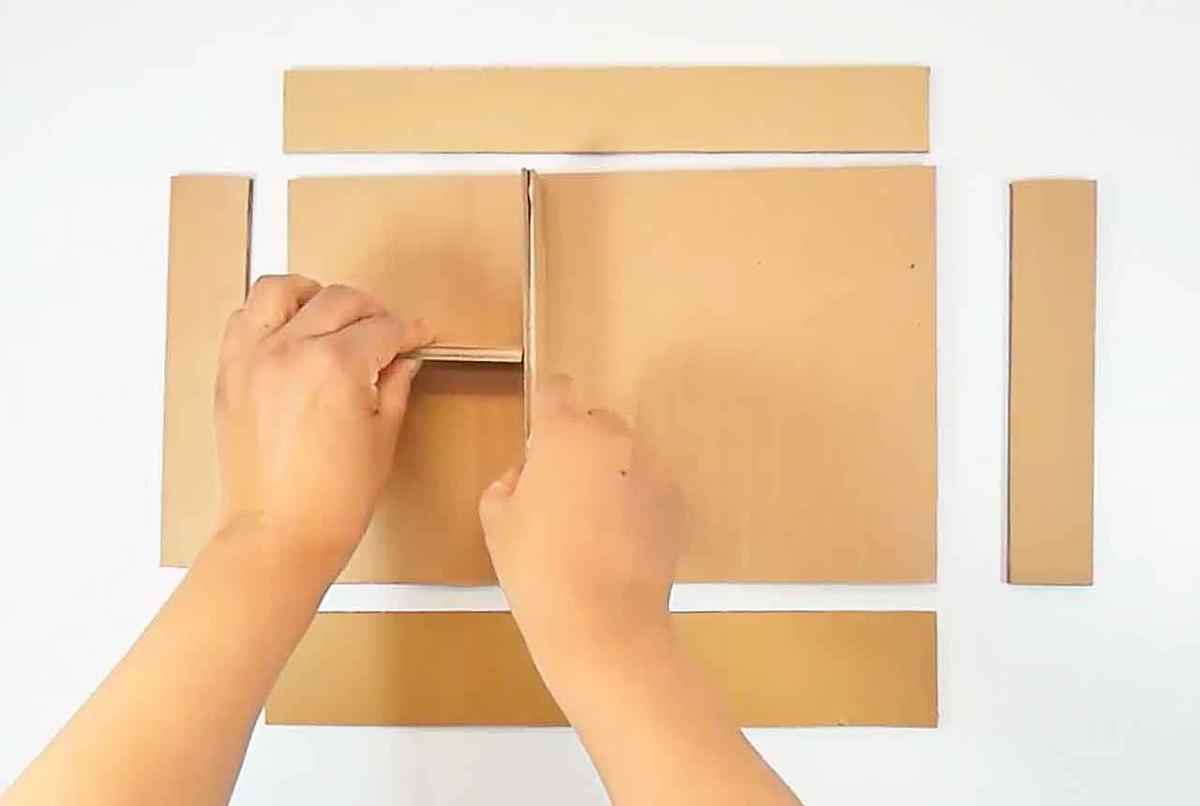 Tomando la medida de la caja de zapatos que tengas, corta las piezas para hacer la gaveta, la base debe entrar y salir fácilmente de la caja.