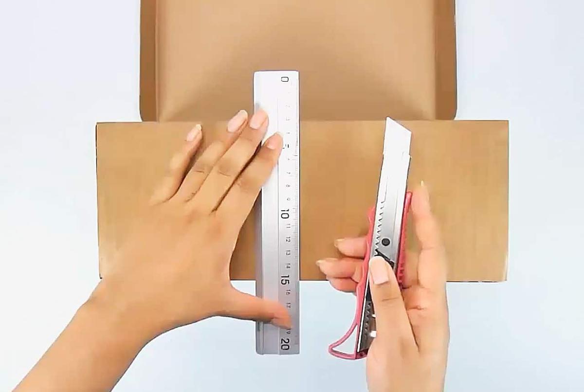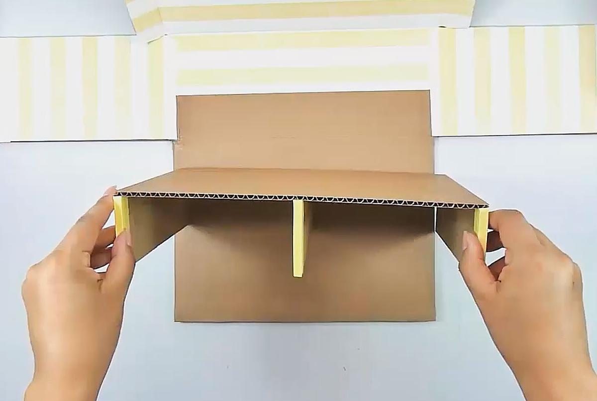 Cortar un trozo de cartón del tamaño del interior de la caja y tres piezas de cartón con un largo del ancho de la caja y de ancho tendrán la mitad del alto de la caja.