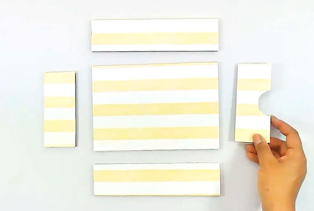 Pegar las tres piezas pequeñas en la pieza más grande, dos a los extremos y una en el centro, cubrir uno de los cantos de las piezas pequeñas.