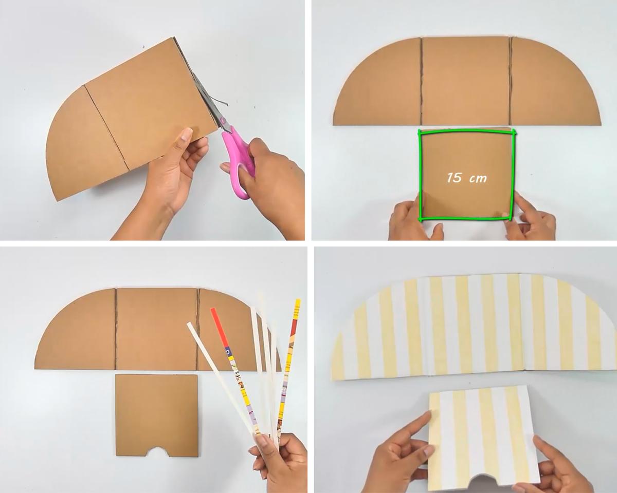 Con esa medida corta dos piezas de la medida que te dió y de 15 cm de ancho, como el resto de piezas, cúbre también el canto con las tiras de cajas de cereales.