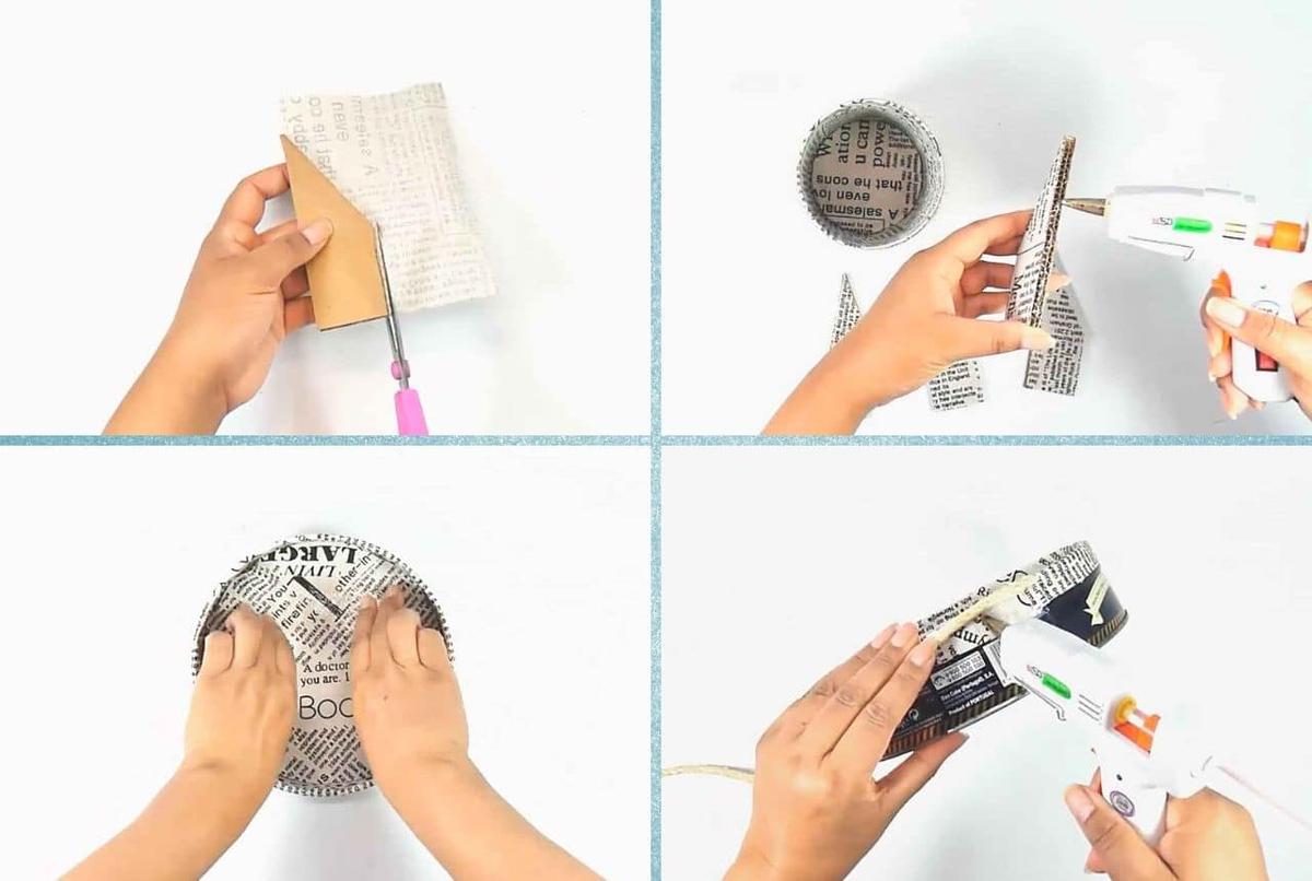 Coloca bastante cola blanca en el interior de la lata y enrolla la tela para introducirla y pegar, asegúrate de que los cortes queden hacia la base de la lata.