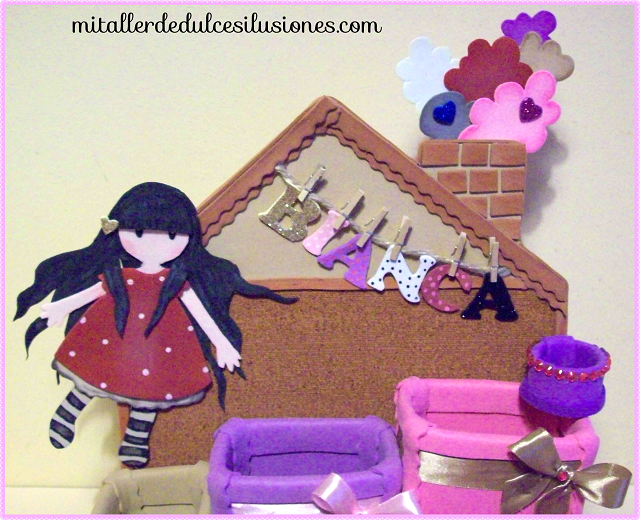 6. Ha llegado el momento de pegar todo en su lugar y decorar nuestra gaveta.Pegar vuestras cajitas en la base en la disposición que habíais pensado,pegar la Gorjuss o lo que queráis también en el lugar que más os guste.Yo he puesto una cuerda simulando una de tender y donde he colgado con unas minipinzas las letras del nombre de mi niña,he puesto unas divertidas nubes de humo de colores saliendo de la chimenea,he decorado con brillantitos algunas cajitas y he añadido algunos botones decorativos en forma de flor al borde de la base que puse simulando césped.Pero ya sabéis que todo va según vuestra imagiuación y vuestros gustos.