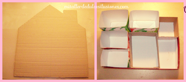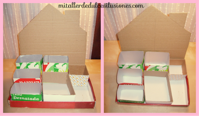 2. Una vez tengamos todas nuestros tipos de cartón vamos a comenzar,la tapa de la cala de zapatos la usaremos cómo base de nuestro organizador,los cartones de leche o cajitas pequeñas de cartón los usaremos para hacer los distintos cubiletes de nuestro organizador y el trozo de cartón lo recortaremos de una medidas para hacer nuestro fondo,yo lo he hecho en forma de casita,las medidas son 30cm de alto por 26cm de ancho,pero daros cuenta de que el ancho dependerá del tamaño de la tapa que hayáis escogido.Recortar vuestra casita y montarlo por encima para ver donde váis a poner vuestros distintas partes de la gaveta.