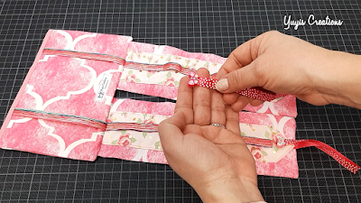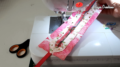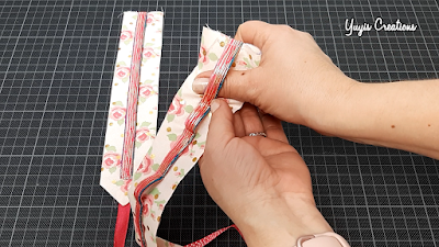 Luego cosemos la cinta encima, esto es a tu gusto. En mi caso, una le he puesto recta y totalmente suelta, es decir, sólo la cosí por arriba y por abajo. La otra cinta la cosí haciendo unos pequeños arcos (ver la imagen de abajo) para lo cual me ayudé de un lápiz. Este paso lo verás más claramente en el vídeo que te dejaré más abajo.
