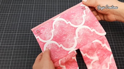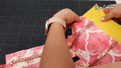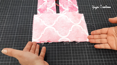 Sobre este pieza colocamos las piezas largas, las pondremos enfrentando los derechos y haciendo coincidir las cintas para que haga la ilusión de haber sido cosida en una sola tira. Luego encima colocamos la otra pieza, con las argollitas en dirección hacia arriba, tal como verás en la siguiente foto. Y cosemos por los lados y por debajo.