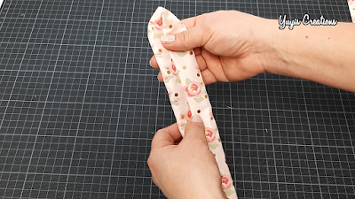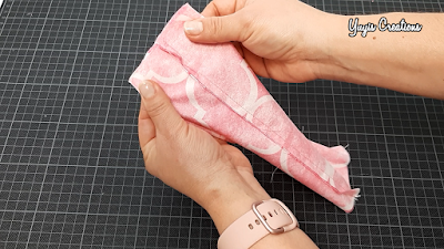A las piezas de tela de 25x18 la vamos a doblar por la mitad por el lado de los 18 cm de forma que nos quede una medida de 25x9 cm y con el revés a la vista y cosemos por el lado más largo. Giramos la costura de forma que quede centrada y cosemos por uno de sus lados, así: