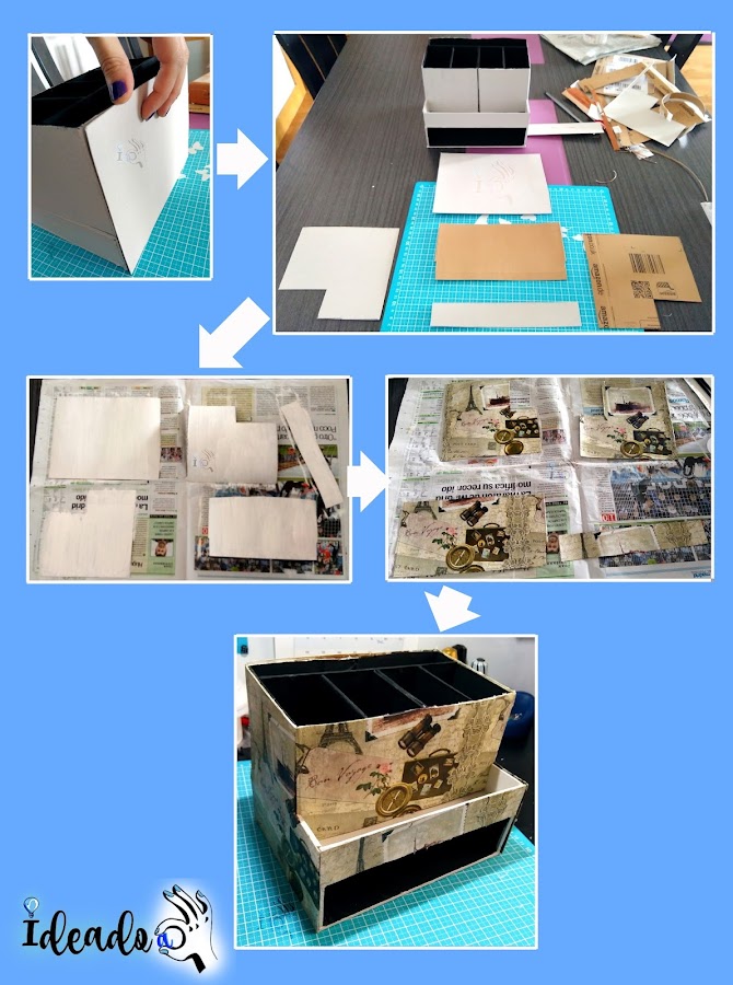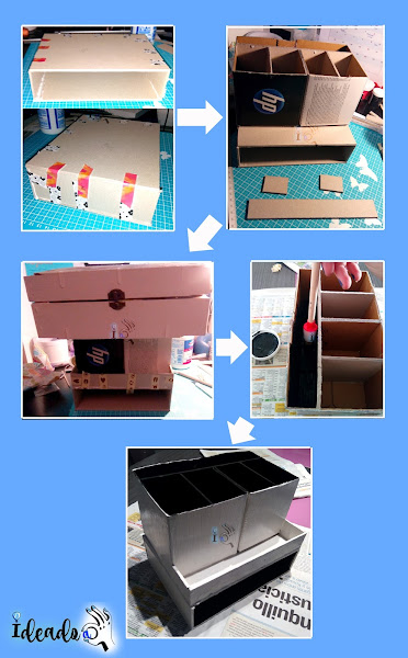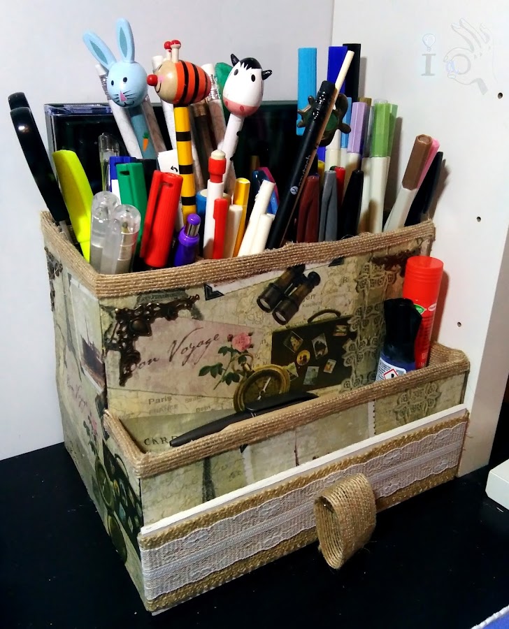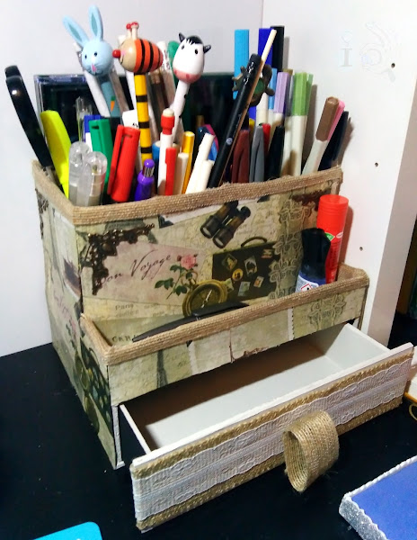 Aquí estoy un viernes más para enseñaros cositas, pero esta vez se trata de un trabajo que no había hecho nunca... cartonaje!! Y es que he hecho un organizador de escritorio con cartones... y sí, aguanta.