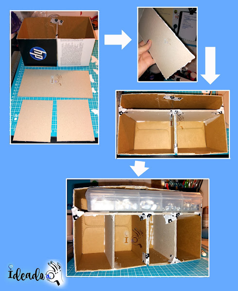 Cuando la parte exterior del cajón está seca presentamos encima los cubos para los bolis, y tomamos las medidas de los cartones que harán las veces de "barandilla del balcón". Luego lo pegamos todo con cola y lo dejamos secar con un peso encima para que quede bien pegado. La base de nuestro organizador ya está hecha y ahora ya solo falta la decoración (bueno, y el cajón).