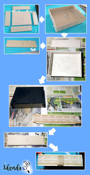 Seguimos haciendo un hueco para poner un cajón debajo. Tenemos que tomar medida del ancho y del profundo, y al profundo le añadiremos un poco (yo no soy mucho de dar medidas porque cada cual se hace las cosas como quiere) pero es para hacer una especie de balconcito para dejar las pequeñas cosas como el pegamento o el cello, así que con 3 o 4cm debería ser suficiente. Estas dos medidas serán las de la base. Luego tenemos que cortar también los tres laterales, dando un alto como para un cajoncito, yo creo que lo suyo es que esté alrededor de los 5cm. Hay que tener en cuenta el grosor del cartón, de manera que si vamos a pegar los laterales por encima de la base la trasera tendrá el mismo largo que el ancho de la base, pero los laterales tendrán de largo el profundo de la base menos la anchura del cartón, porque si no sobresaldrían por delante. Luego se pone otra pieza igual para la tapa y se pega todo con cola de carpintero.