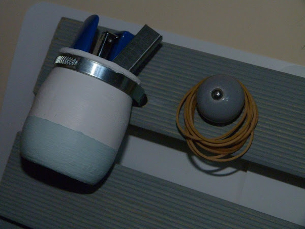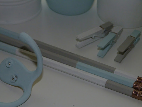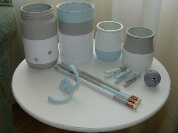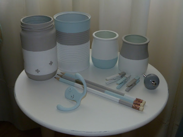 He añadido además de los anteriores, dos tarros de yogur, unas pinzas de madera también pintadas combinando blanco, azul y gris, un colgador dorado de dos ganchos pintado en azul, y un pomo de cerámica gris que tenía en casa esperando su momento.