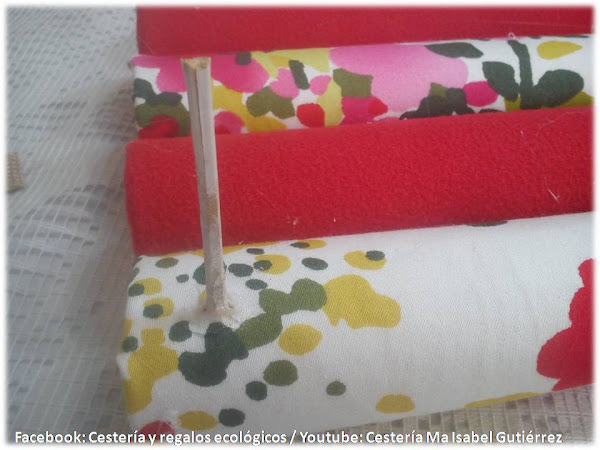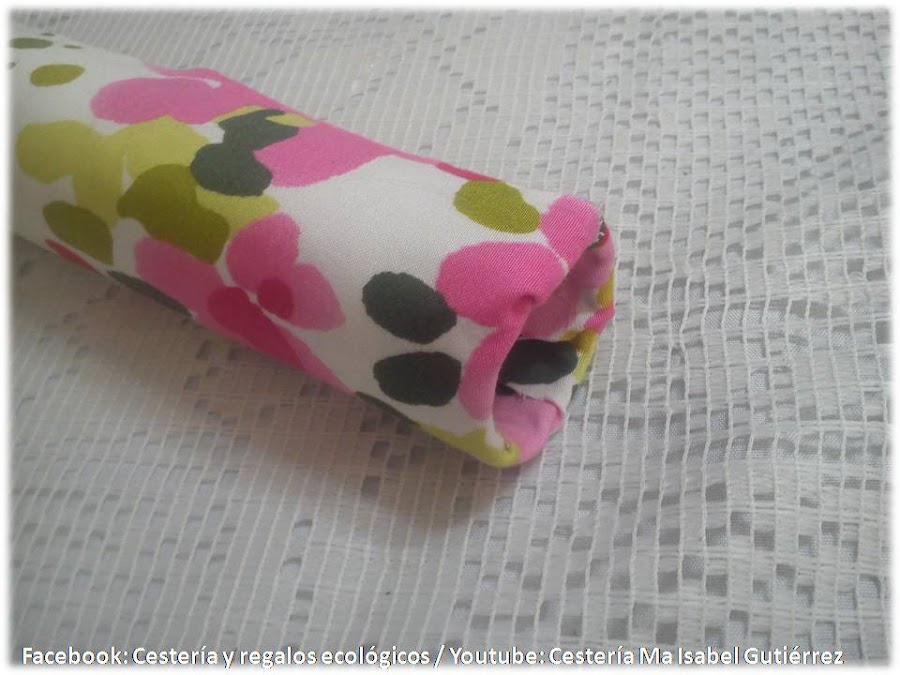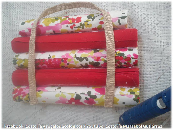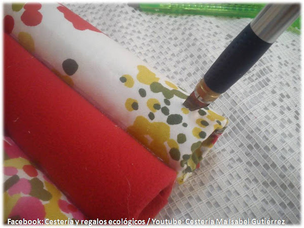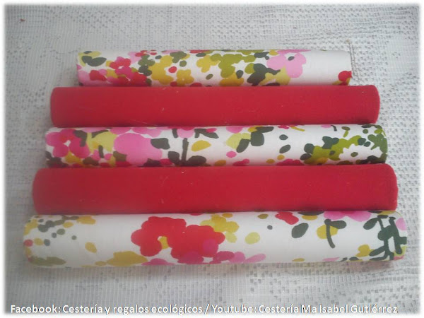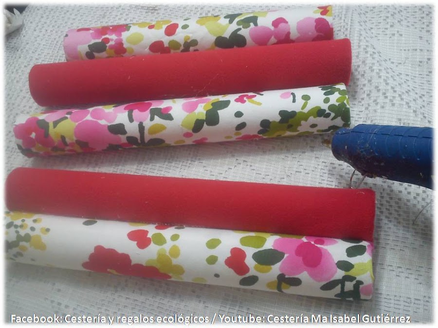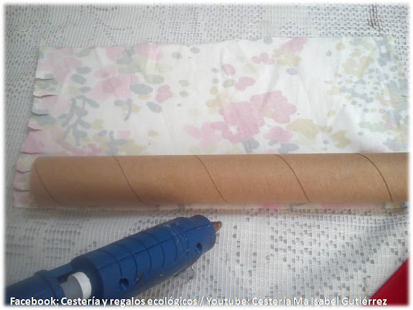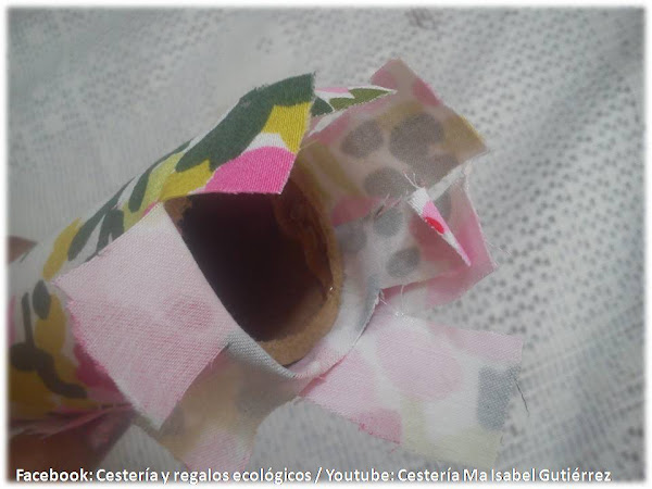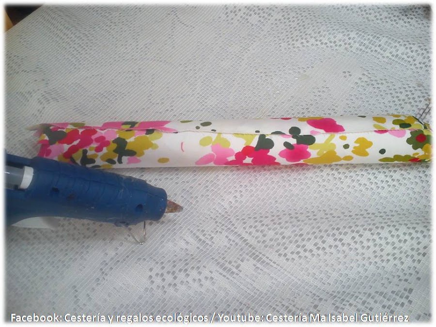 Cortamos tiras de tela con el tamaño adecuado para cubrir completamente el tubo, y dejar un margen extra de aproximadamente 2 cms., en cada extremo; recortamos un poco los extremos tal como se aprecia en la imagen, ponemos silicón a lo largo del tubo de cartón, acomodamos sobre la tela y empezamos a forrar deslizando el tubo...