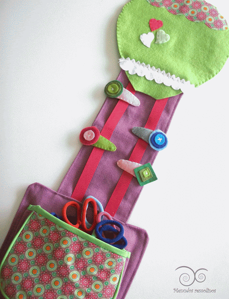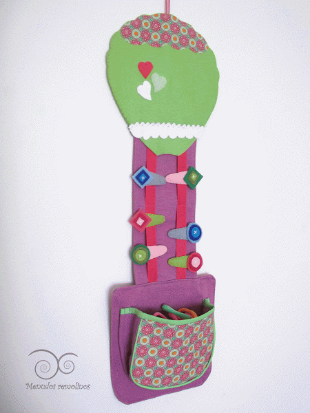 Este primer diseño de organizador está pensado en forma de globo aerostático, en tonos rosas y verdes pistacho, (una combinación que me gusta muchísimo). La parte central está formada por dos cintas donde se pueden sujetar las horquillas y clips, y la parte de abajo está rematada por un bolsillo-cesta para guardar gomas de pelo, pasadores, pincitas para el cabello, y cualquier otro complemento que vuestras niñas quieran recoger.