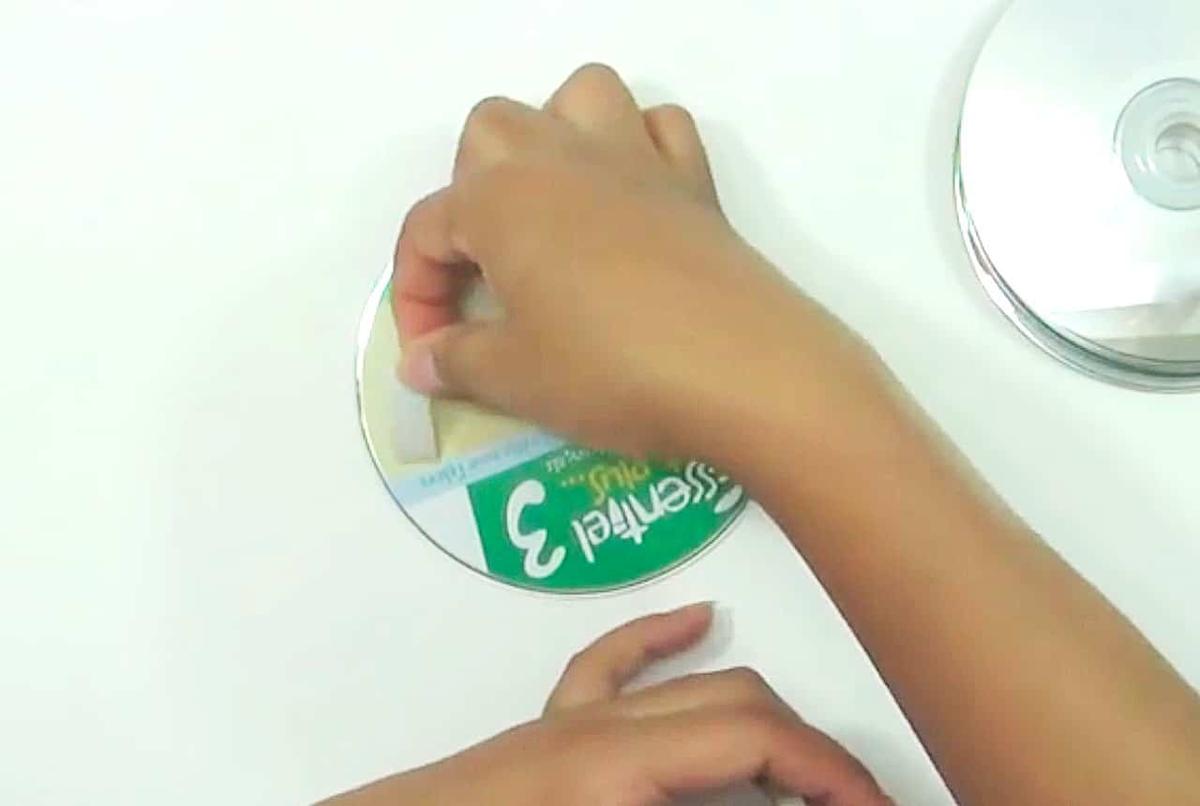 Pega unos cuantos cds para formar la base de 1 cm de alto, utiliza cinta de doble cara para fijarlos, cubre el canto con una cinta o tira.