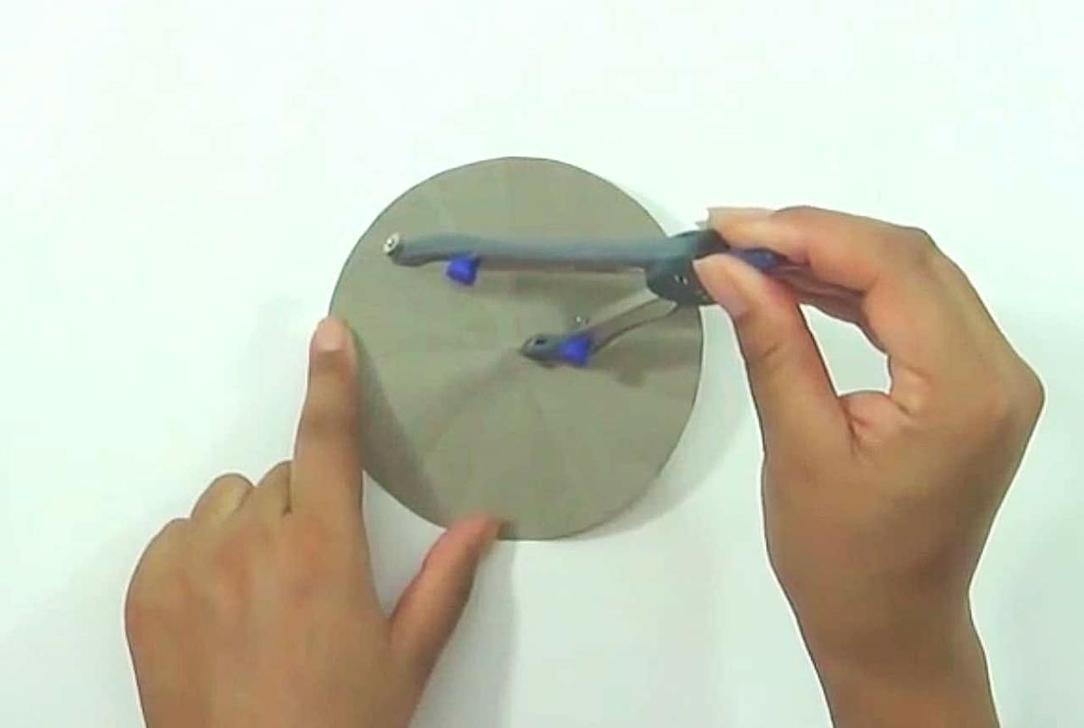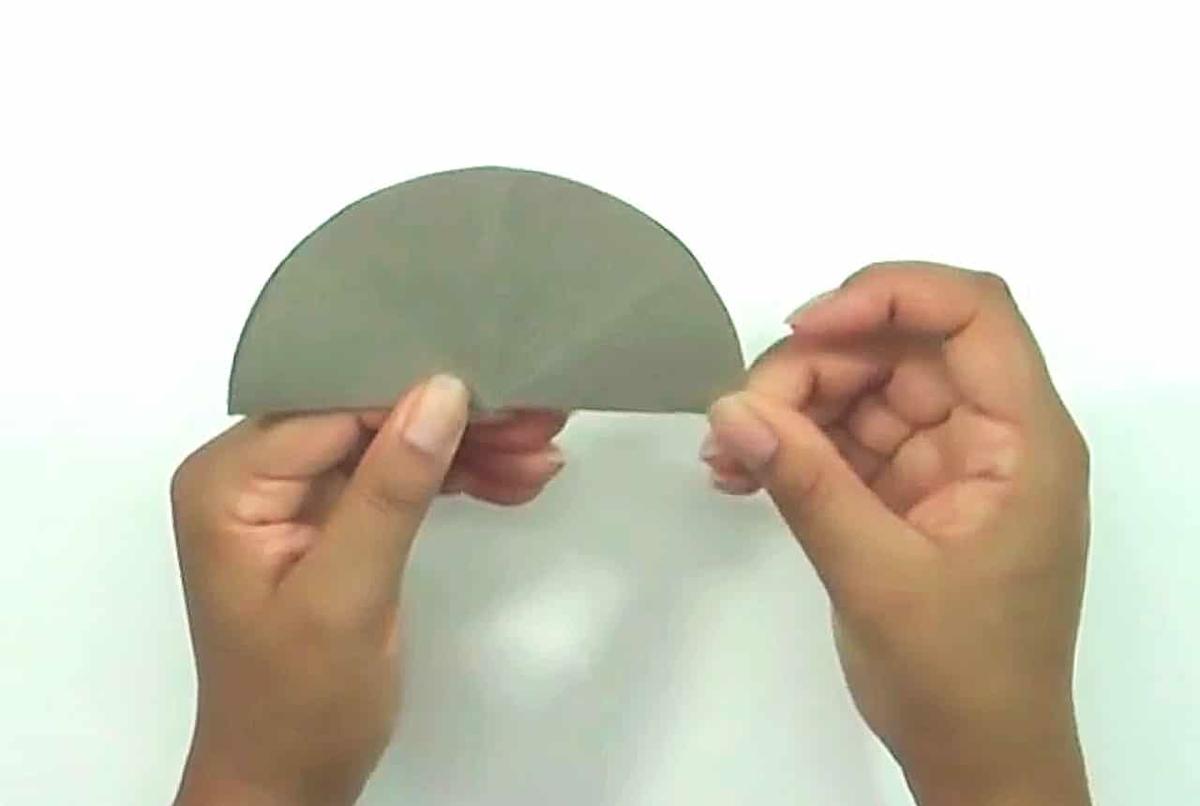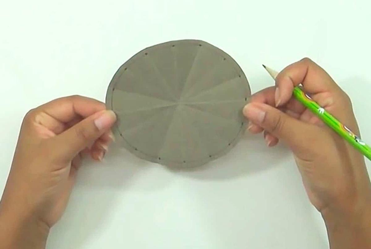 Corta un círculo de cartulina del tamaño del cd, dóblalo a la mitad, ábrelo y dóblalo de forma contraria, uniendo las marcas del doblez anterior. Vuelve a abrirlo y dóblalo de tal forma que se marque la mitad de cada cuarto, repite hasta que tengas 4 dobleces por cada cuarto del círculo.