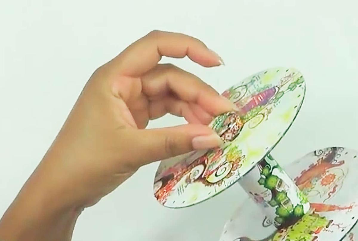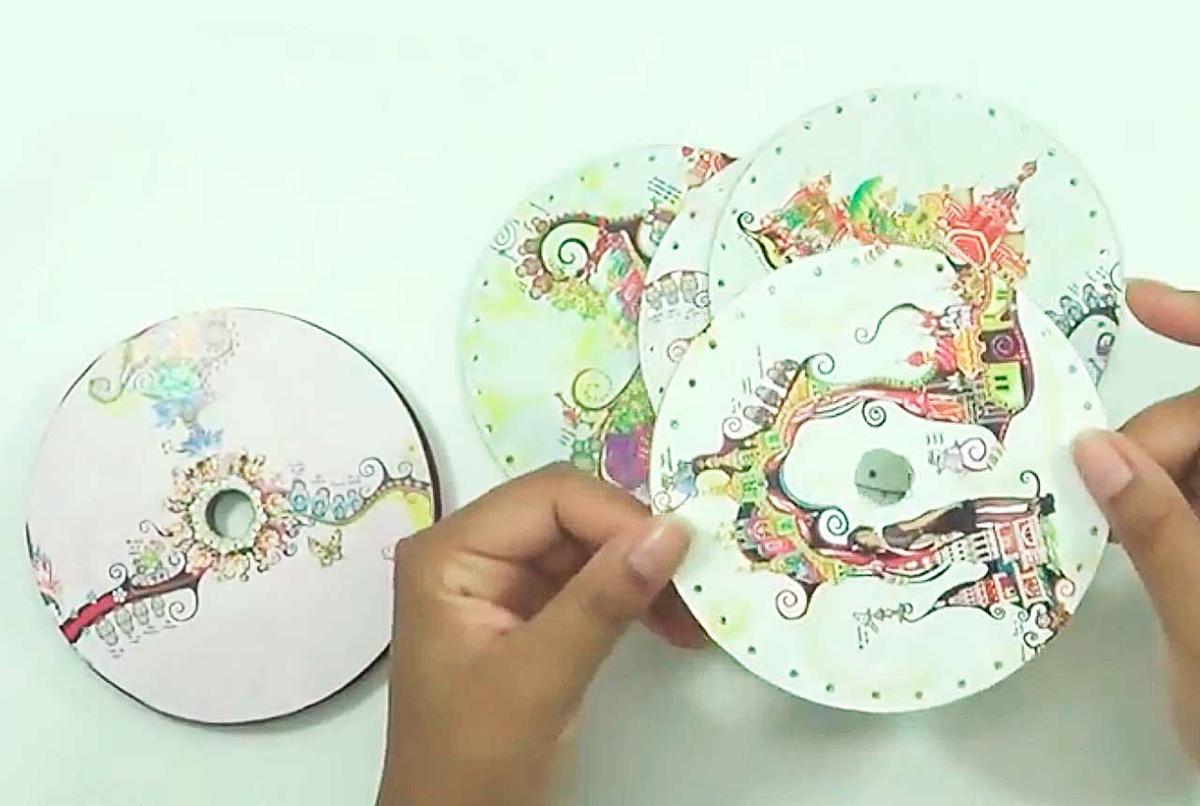 Decora 4 cds (o tantos cd como niveles quieras en tu organizador)y pon encima el círculo de cartulina, pon cinta adhesiva por fuera para mantenerlos juntos.