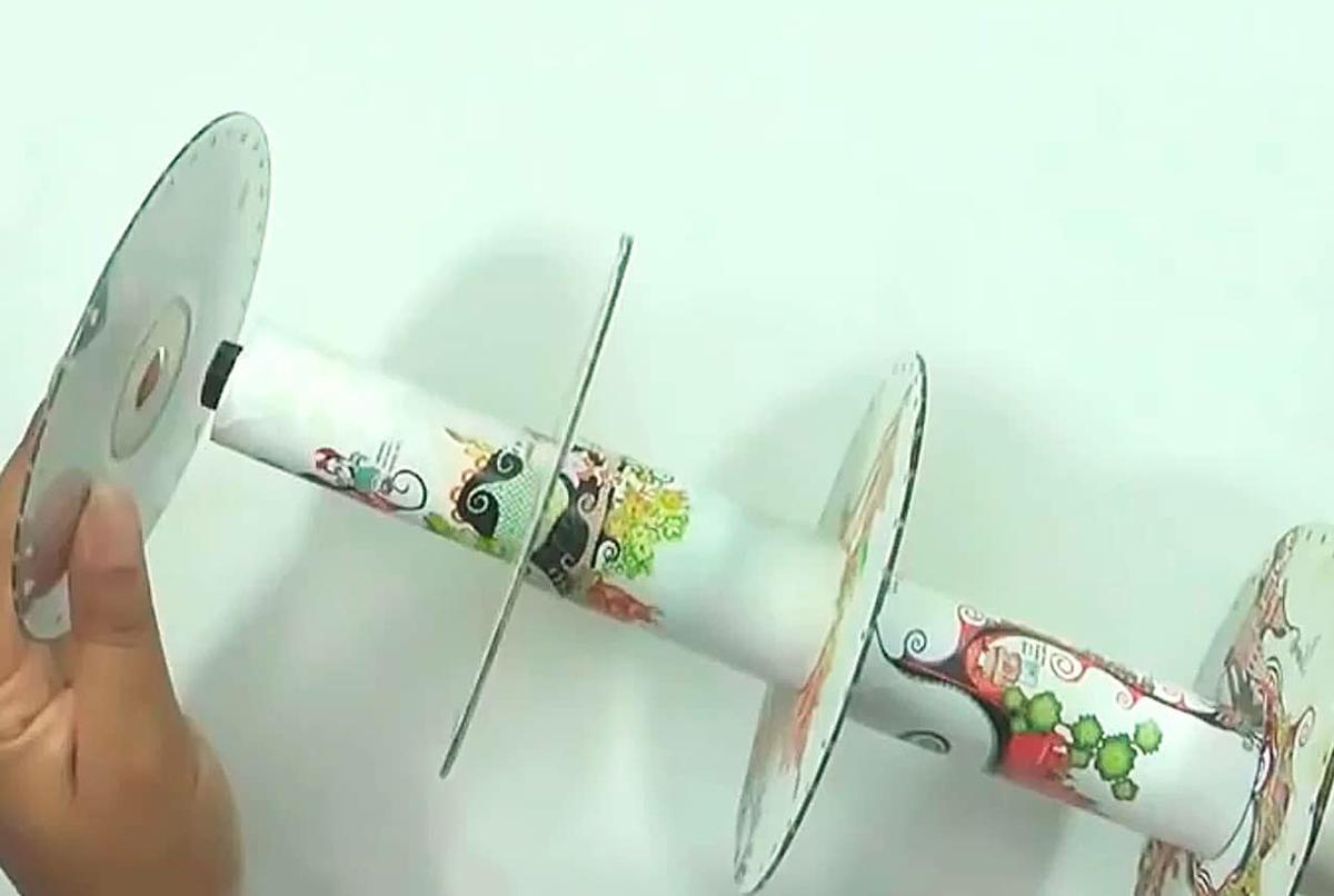Para el montaje ve colocando un tubo y un cd alternadamente sin usar pegamento en los cds para que puedan girar.