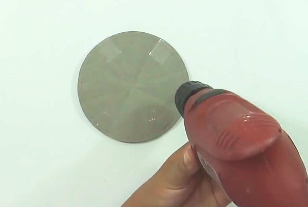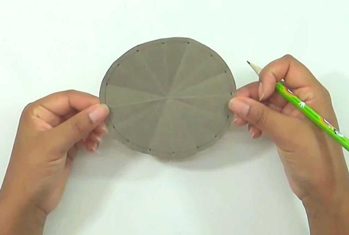 Cortar un círculo de cartulina del tamaño del cd, doblar a la mitad, abrir y doblar de forma contraria, unir las marcas del doblez anterior. Volver a abrirlo y doblar de tal forma que se marque la mitad de cada cuarto, repetir hasta que tengas 4 dobleces por cada cuarto del círculo.