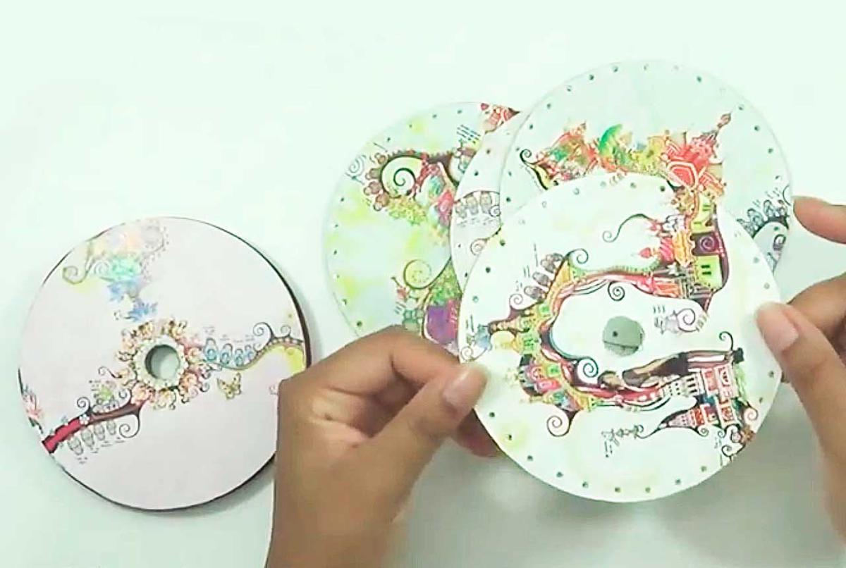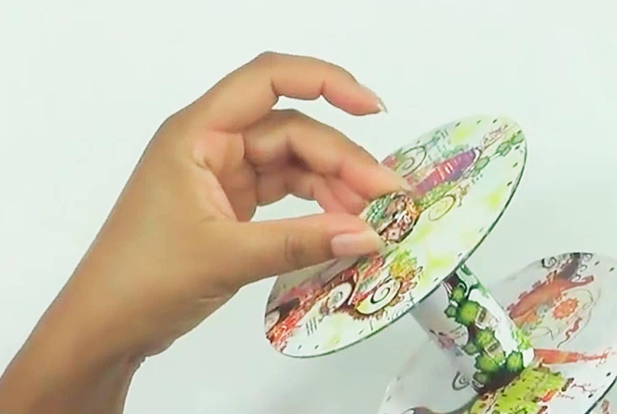 Decorar 4 cedés (o tantos cd como niveles quieras en tu organizador) y poner encima el círculo de cartulina, poner cinta adhesiva por fuera para mantenerlos juntos.