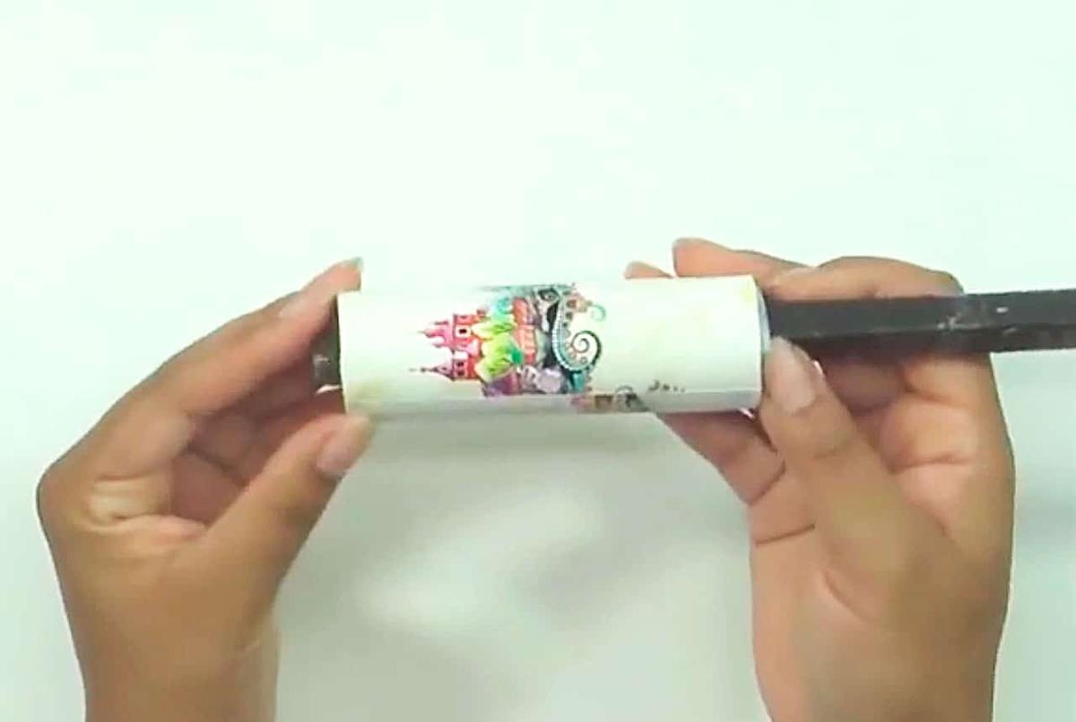 Forrar un tapa con el mismo papel que el resto y pegar en la parte superior con silicona caliente.