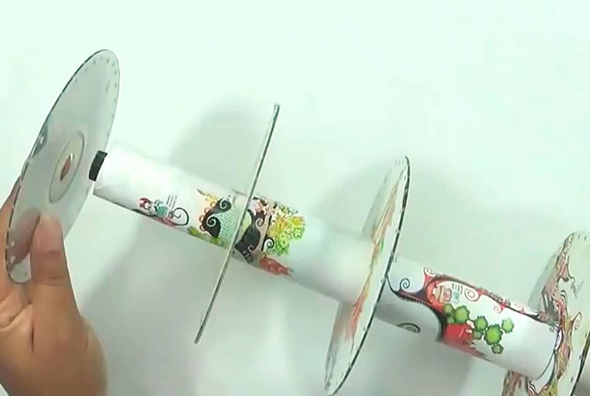 Colocar un tubo y un cd alternadamente sin usar pegamento en los cds para que puedan girar.