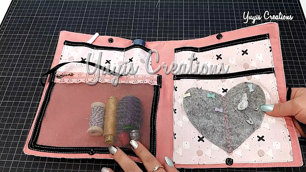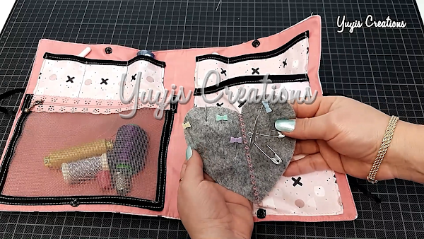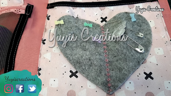 También tiene un corazón de fieltro con las solapas libres para poder clavar en él agujas, imperdibles y alfileres.