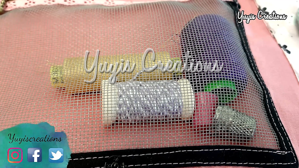Un bolsillo grande como para guardar un pequeño bastidor, tela u otras cosas. Tiene otro bolsillo de buen tamaño, con cremallera y hecho de malla para que a simple vista veas lo que guardas en él.