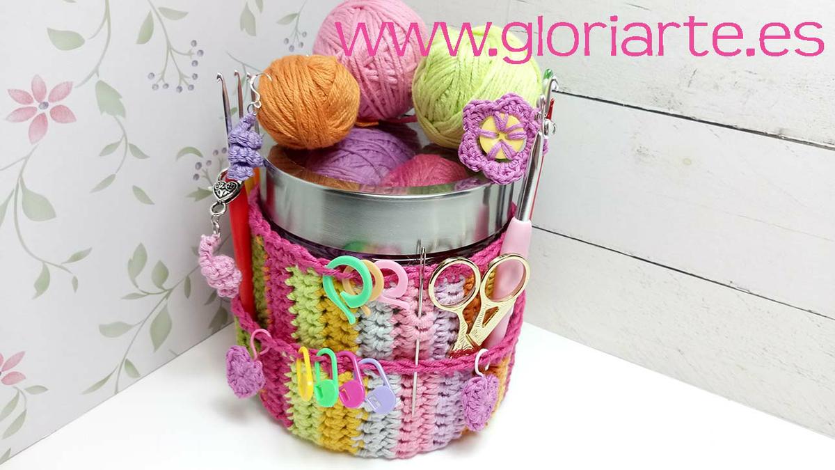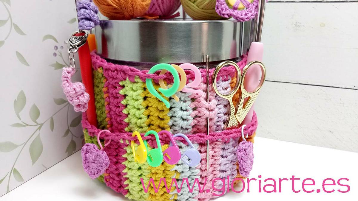 Para que quede bien ajustado el organizador, y no resbale en nuestro frasco, teje una cantidad de vueltas necesarias para que al coser el cilindro de ganchillo quede bastante apretado, es mejor hacer una vuelta de menos que una vuelta de más, en caso de duda.