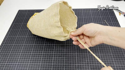 Ahora vamos a coser la parte superior e inferior de la bolsa. Vamos a hacerle el espacio por donde irá la cinta y la elástica. Para ello doblamos medio centímetro y luego doblamos 2 cm, planchamos y cosemos por el borde, dejando los laterales abiertos porque por aquí meteremos las cintas.