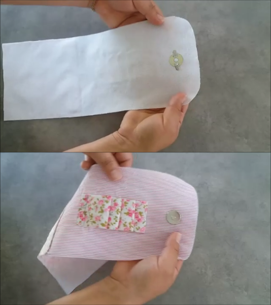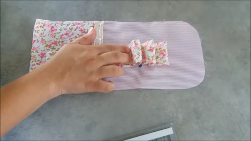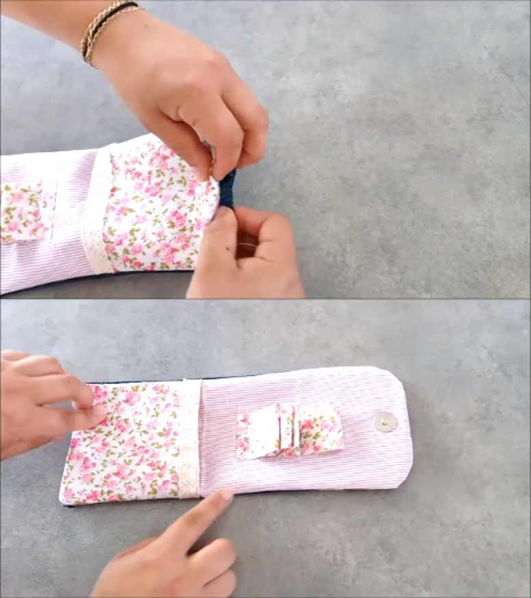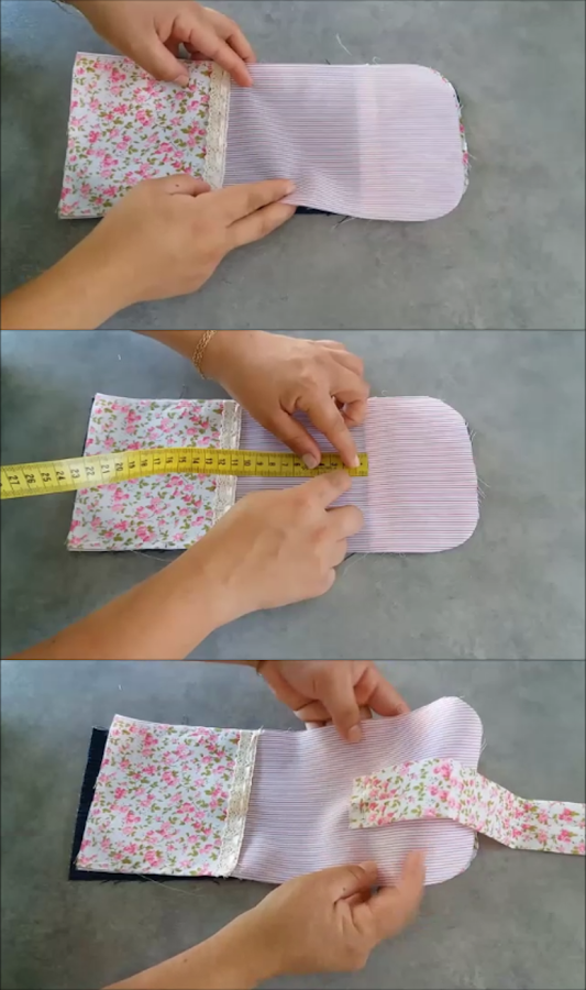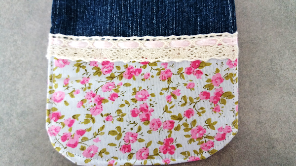 Ahora hacemos el bolsillo, empezamos por hacerle un dobladillo a lo que será la abertura y cosemos por el borde poniendo también el encaje para hacerlo más bonito y delicado, pero este paso es opcional.