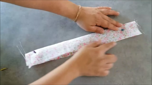 Ahora, vamos a desplazar la costura hacia el centro de la tira, y abrimos la costura, sujetamos con un alfiler y cosemos a 1 cm del borde.