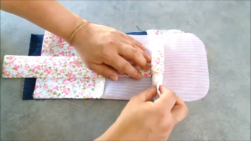 Cerramos la abertura haciendo un pequeño dobladillo hacia adentro y cosemos. Aprovechamos esa misma puntada para pasarle a todo el contorno y de esta forma asentar las telas.