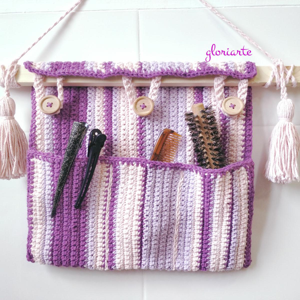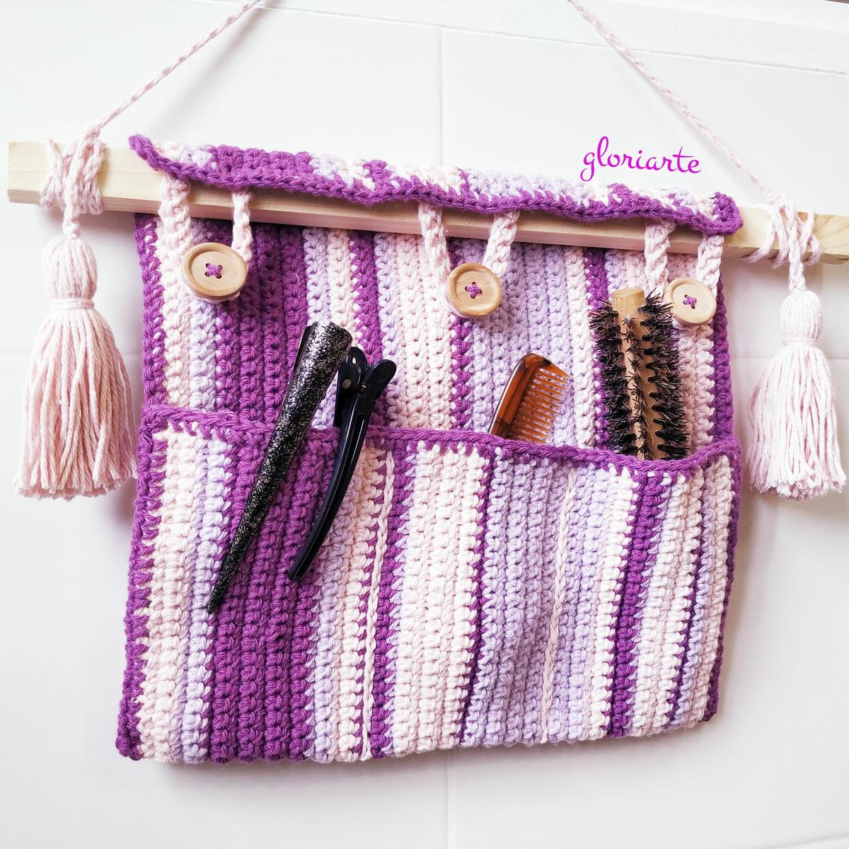 Con un sencillo rectángulo básico de ganchillo o crochet, se pueden hacer muchas ideas creativas, por ejemplo este práctico y bonito organizador. Además no necesitamos comprar ovillos o madejas nuevas, pordemos usar restos de lana, estambres o hilos que tengamos por casa, como he hecho yo, que he usado alodones en tonos rosas y violetas para tejerlo .