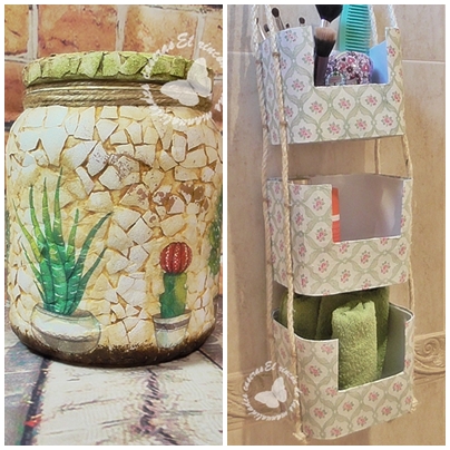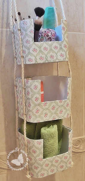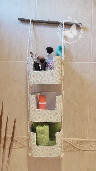 Y la siguiente idea es un organizador de pared, utilizando tres recipientes de plástico iguales, una cuerda y decorado con una servilleta, en el podemos organizar nuestras cosas del baño, del taller o de la habitación de los peques.