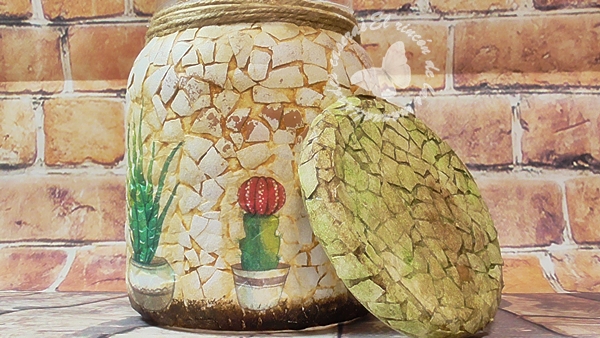 Hoy os traigo un bote decorado con cáscara de huevo imitando un craquelado y decorado con una servilleta de cactus, que me encanta, en el podemos guardar pequeñas cosas.